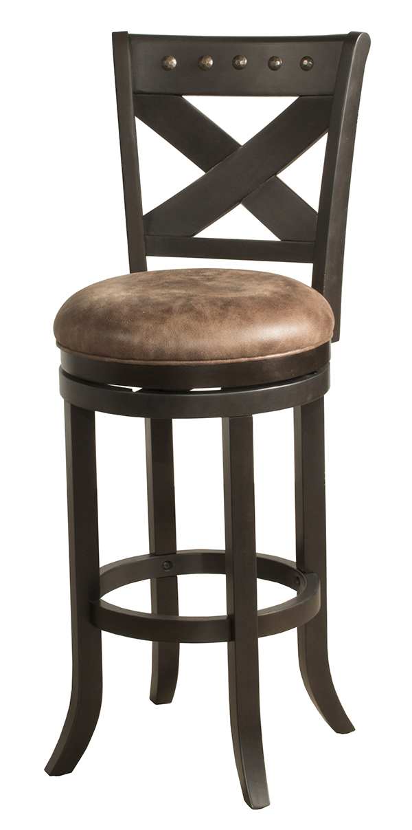 With all the charm of a pastoral ranch and all the dignity of equestrian aesthetics. The Hillsdale Furniture Brantley Bar Height Stool is a gorgeous addition to your kitchen island or counter height dining table. The Deep Brown wood with Antique Bronze nailhead accents and Brown faux leather padded seat possess not only rustic grandeur -- but also unparalleled comfort. Slightly bowed crossback seat and perfectly placed footrests (combined with 360° swivel) allow for maximum relaxation. Some assembly required.