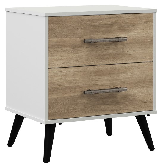 Crafted from durable wood with mid-century lines, this white nightstand has two drawers in contrasting gray wood with decorative metal pulls and full extension gilding for ease of use. Plus, four angled black wood tapered legs that give it proper support and visual appeal at any bedside. Assembly required.Read More