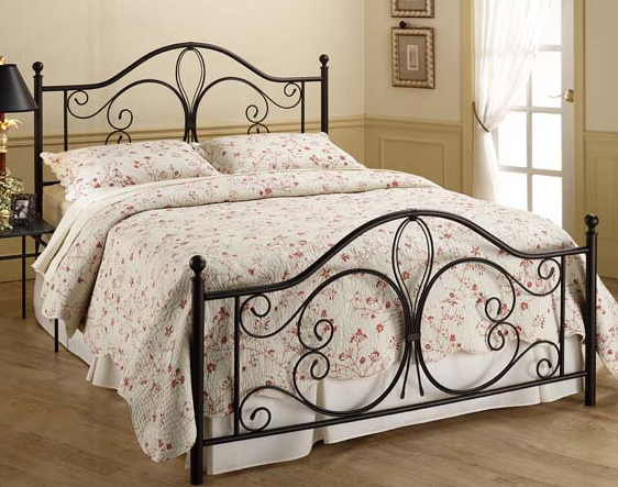 Transitional design features traditional post and final silhouette that is captured by a tear drop center wire motif and flowing scrolls. Antique brown textured powder coat finish. Fully welded construction featuring heavy gauge round tubing and solid wire