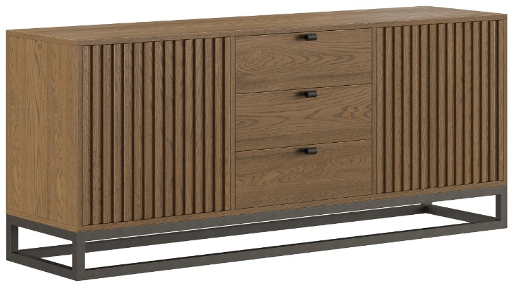 Industrial modern entertainment console boasts a mixed-media design and holds TVs that measure up to 70 inches
