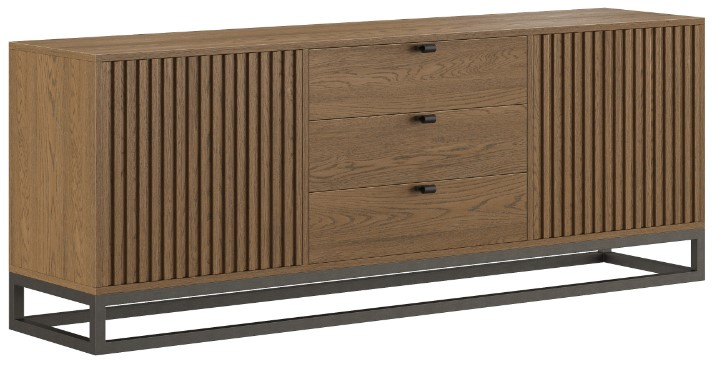This entertainment console boasts clean lines and a sleek mixed-media design. The console features a vibrant, textured wood grain that peeks through a light brown finish, while the heavy-gauge metal base is finished in a brushed bronze with black undertones.Read More