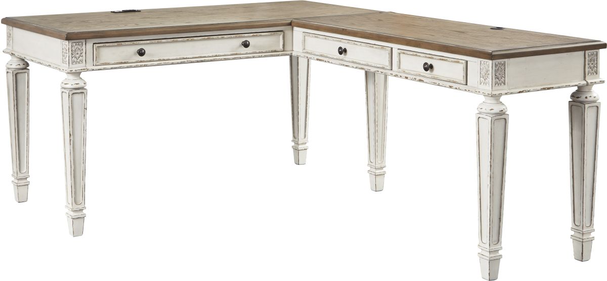Elevating the art of traditional cottage styling, this L-shaped desk is your heavenly home office realized. Its two-tone finish combines chipped white with distressed wood tone tops for added charm. Framed drawer fronts, decorative corbels and elegantly turned and tapered legs add refinement, while dark bronze-tone knobs lend a classic touch.Read More